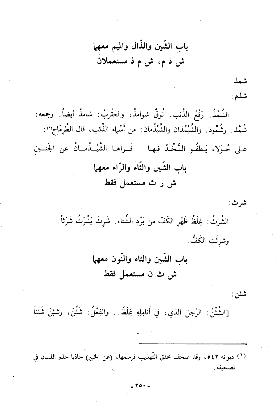 شمذ شذم: الشَّمذ: رفع الذَّنب. نوقٌ شوامذُ، والعقربُ: شامذٌ أيضاً. وجمعة: شُمذ وشُموذ. والشَّيمذان والشَّيذمان: من أسماء الذئب، قال الطِّرماح «1» :