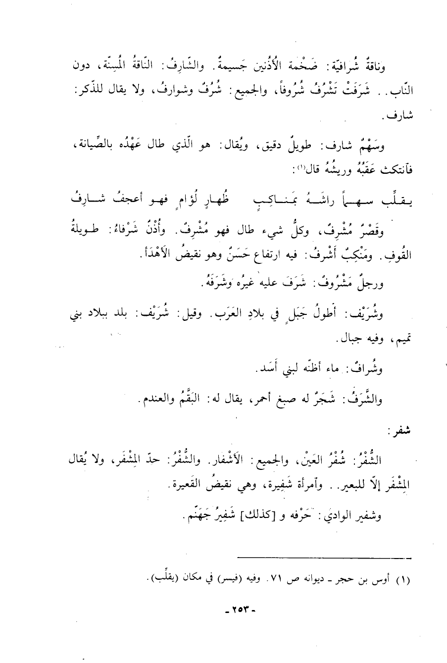 وقصر مشرفٌ، وكلُّ شيء طال فهو مشرفٌ. وأذنٌ شرفاءُ: طويلةُ القوفِ. ومنكبٌ أشرف: فيه ارتفاع حسنٌ وهو نقيض الأهدأ. ورجل مشروف: شرف عليه غيره وشرفهُ. وشريف: أطولُ جبلٍ في بلادِ العرب. وقيل: شريف: بلد ببلاد بني تميم، وفيه جبال. وشُرافٌ: ماء أظنّه لبني أسد. والشَّرفُ: شجرٌ له صبغ أحمر، يقال له: البقَّمُ والعندم.