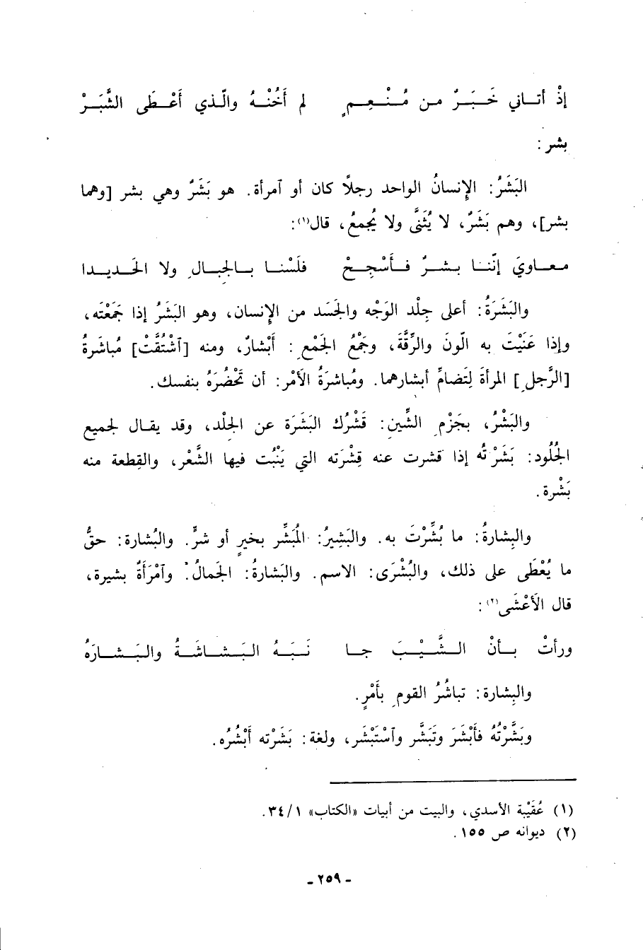بشر: البَشَر: الإنسانُ الواحد رجلاً كان أو امرأة. هو بَشَرٌ وهي بشر [وهما بشر] ، وهم بَشَرٌ، لا يُثَنَّى ولا يُجمع، قال «1» :