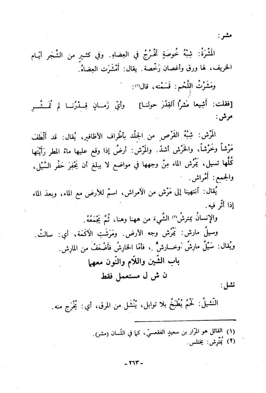 مرش: المرش: شبهُ القرص من الجلد بأطراف الأظافير، يُقال: قد ألطف مرشاً وخرشاً، والخرش أشدّ. والمرش: أرضٌ إذا وقع عليها ماءُ المطر رأيتها كلَّها تسيل، يمرُش الماء من وجهها في مواضع لا يبلغ أن يحفر حفر السيل، والجمع: أمراش. يقال: انتهينا إلى مرش من الأمراش، اسم للأرض مع الماء، وبعد الماء إذا أثر فيه. والإنسانُ يمترشُ «2» الشَّيءَ من هاهنا وهنا، ثمَّ يجمعه. وسيلٌ مارش: يمرش وجه الأرض. ومَرشتِ الأكمة، أي: سالت. ويقال: سيل مارش وخارش، فأما الخارشُ فأضعفُ من المارِش.