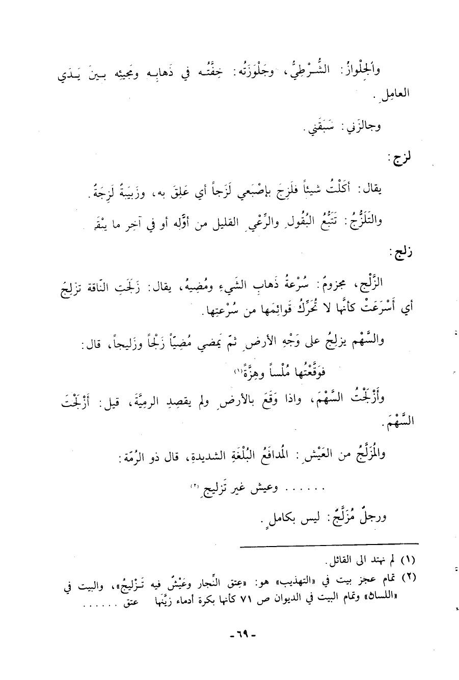 زلج: الزَّلج، مجزومٌ: سرعة ذهاب الشيء ومُضِيهُ، يقال: زَلَجَتِ النّاقة تزلِجُ أي أسرعت كأنَّها لا تحرِّك قوائمها من سرعتها. والسَّهم يزلجُ على وجه الأرض ثم يمضي مضياً زَلجاً وزَليجاً، قال: