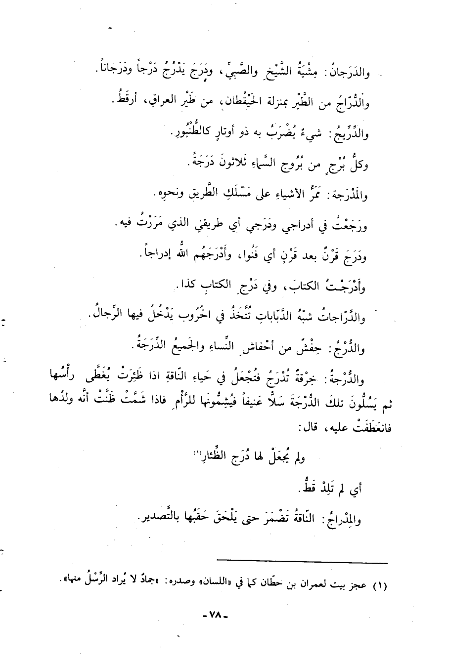 والدَرَجانُ: مشية الشيخ والصَّبيّ، ودَرَجَ يَدرجُ دَرجاً ودَرَجاناً. والدُّرّاجُ من الطير بمنزلة الحيقطان، من طير العراق، أرقَط. والدِّرِّيجُ: شيء يضرب به ذو أوتارِ كالطَّنبور. وكلُّ بُرجٍ من بروج السَّماء ثلاثون دَرَجَة. والمَدرَجة: ممرُّ الأشياء على مسلك الطَّريق ونحوه. ورجعتُ في أدراجي ودرجي أي طريقي الذي مررتُ فيه. ودَرَجَ قرنٌ بعد قَرنٍ أي فنوا، وأدرجَهُم الله إدراجاً. وأدرجتُ الكتاب، وفي دَرجٍ الكتاب كذا. والدَّراجات شبه الدّبّابات تتخذ في الحروب يدخل فيها الرِّجالُ. والدُّرجُ: حِفشٌ من أحفاشِ النساء والجميع الدِّرجة. والدرجة: خرقة تدرج فتجعَل في حَياء النّاقة إذا ظئرت يُغطى رأسها ثم يَسلُّون تلك الدُّرجةُ سلا عنيفاً فيشمُّونها للرأم فإذا شمَّت ظنَّت أنَّه ولدها فانعطفت عليه، قال: