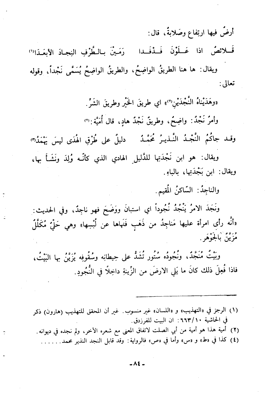 ويقال: هو ابن نجدتها للدَّليل الهادي الذي كأنه ولد ونشأ بها، ويقال: ابن بَجَدَتِها، بالباء. والناجِدُ: السّاكنُ المُقيم. ونَجَدَ الأمرُ ينجُدُ نجودا أي استبان ووضح فهو ناجِدٌ،