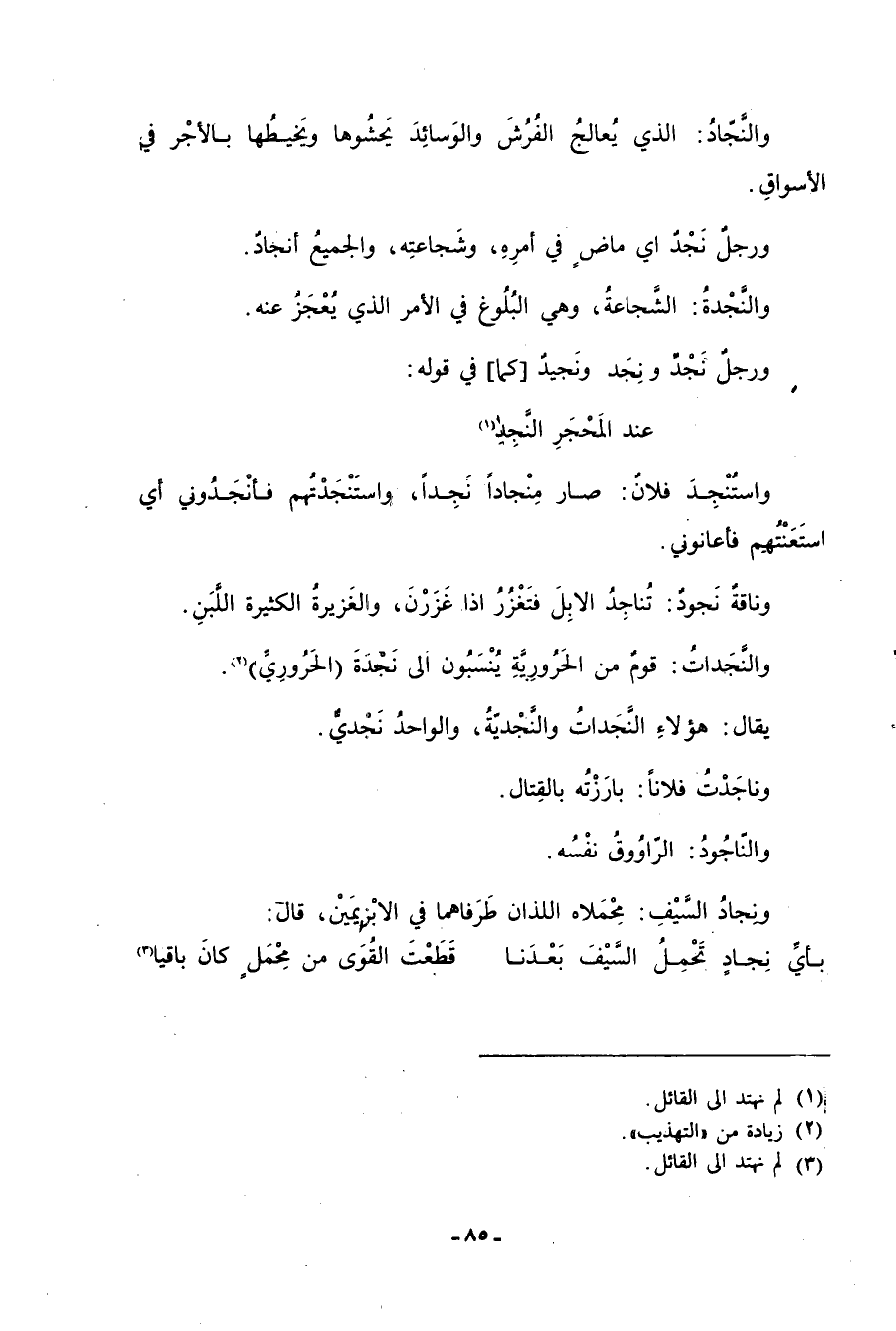 والنِّجّادُ: الذي يعالج الفرش والوسائد يحشوها ويخيطها بالأجر في الأسواق. ورجل نجدٌ أي ماضٍ في أمره، وشجاعته، والجميع أنجادٌ. والنَّجدةُ: الشَّجاعةُ، وهي البلوغ في الأمر الذي يُعجزُ عنه. ورجلٌ نَجدٌ ونِجَد ونَجيدٌ [كما] في قوله: