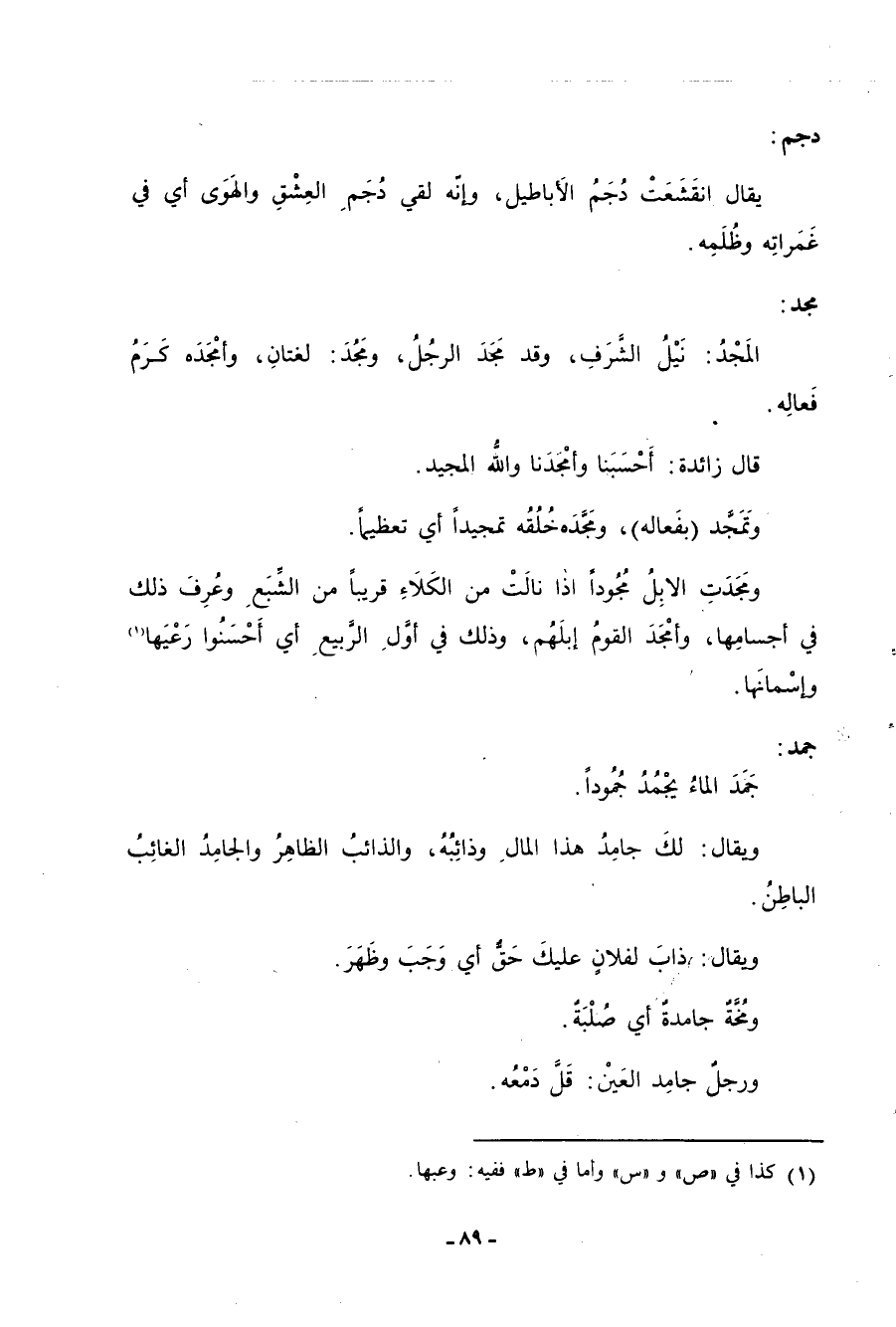 مجد: المَجدُ: نيل الشَّرف، وقد مَجَدَ الرجل، ومَجُدَ: لغتان، وأمجَدَه كرمُ فعالهِ. قال زائدة: أحسبنا وأمجدنا والله المجيد. وتمجد (بفعاله) ، ومَجَّدَه خُلُقُه تمجيداً أي تعظيماً. ومَجَدَتِ الإبلُ مُجُوداً إذا نالت من الكلاءِ قريباً من الشِّبع وعُرفَ ذلك في أجسامها، وأمجَدَ القومُ إبلهم، وذلك في أول الرَّبيع أي أحسنوا رعيها «1» وإسمانها.
