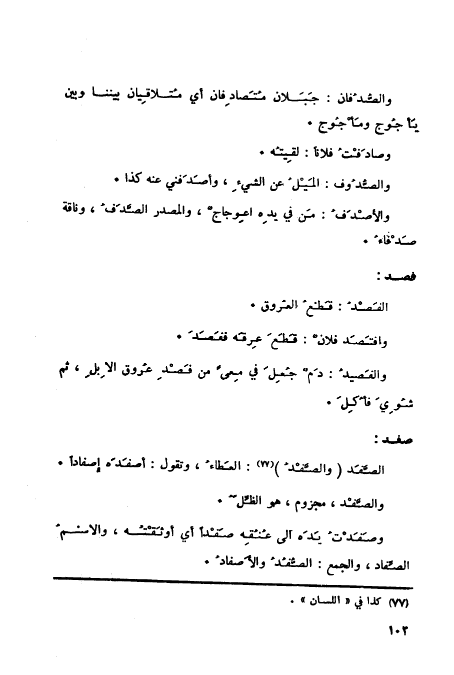 والصُّدُفان: جَبَلان مُتَصادِفان أي مُتلاقِيان بيننا وبين يَأجُوج ومَأْجُوج. وصادَفْتُ فلاناً: لقِيتُه. والصُّدُوف: المَيْلُ عن الشيءِ، وأصَدَفني عنه كذا. والأصْدَفُ: مَن في يده اعِوجاجٌ، والمصدر الصَّدَفُ، وناقة صَدْفاءُ.