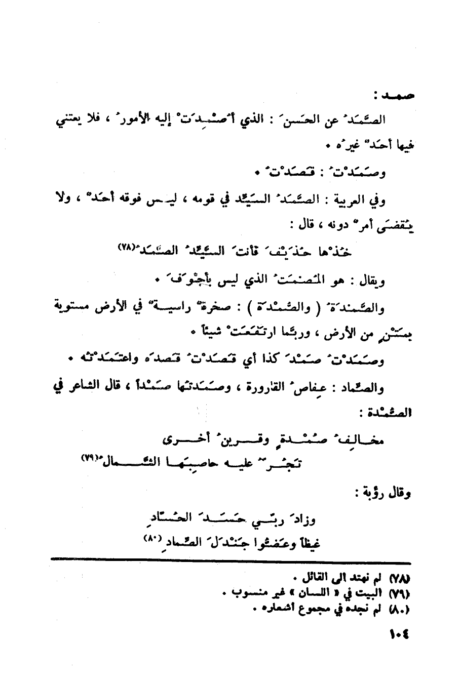 صمد: الصَّمَدُ عن الحَسنَ: الذي أصمدت إليه الأمورُ، فلا يعتني فيها أحَدٌ غيرُه. وصَمَدْتُ: قَصَدْتُ. وفي العربية: الصَّمَدُ السّيِّد في قومه، ليس فوقه أحَدٌ، ولا يُقضَى أمرٌ دونه، قال: