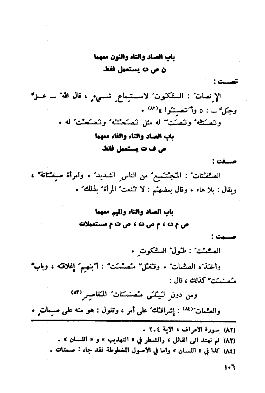 (84) كذا في اللسان وأما في الأصول المخطوطة فقد جاء: صمتات.