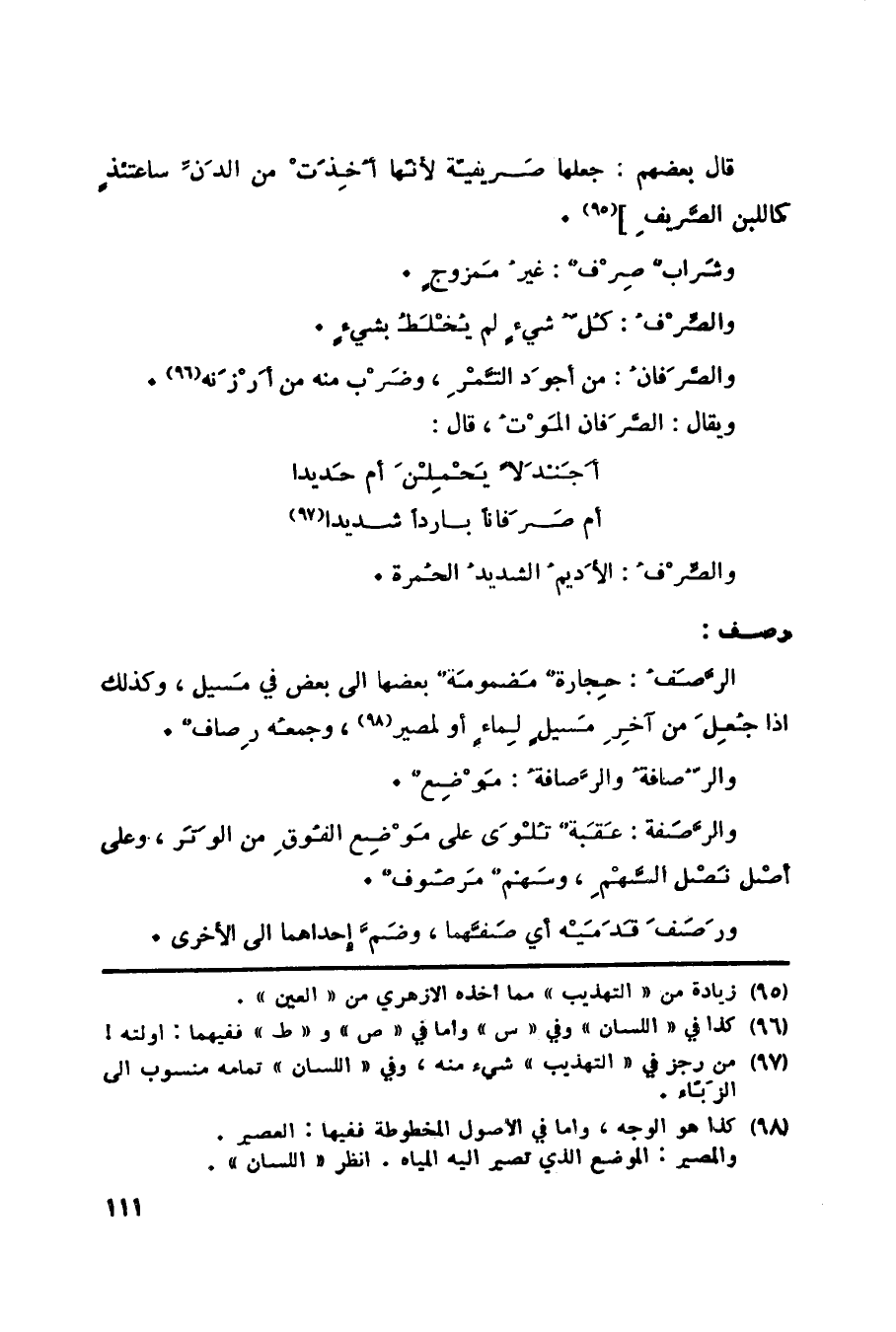 قال بعضهم: جعلها صَريفيّة لأنّها أُخِذَتْ من الدَنِّ ساعتئذ كاللبن الصَّريفِ] «95» . وشَرابٌ صِرْفٌ: غيرُ مَمزوجٍ. والصِّرْفُ: كُلُّ شيءٍ لم يُخْلَطُ بشيءٍ. والصِّرَفانُ: من أجوَد التَّمْرِ، وضَرْب منه من أَرْزَنه «96» . ويقال: الصَّرَفان المَوْتُ، قال: