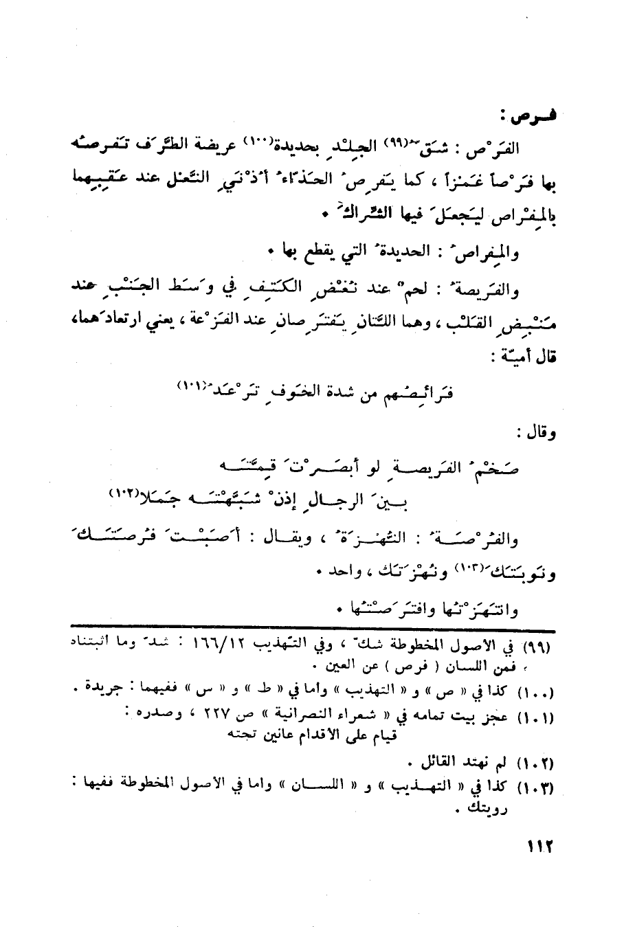 فرص: الفَرْص: شَقُّ «99» الجِلْدِ بحديدة «100» عريضة الطَّرَف تَفرصُه بها فَرْصاً غَمزاً، كما يَفرِصُ الحَذّاءُ أُذْنَيِ النَّعْل عند عَقِبِهما بالمِفْراص ليَجعَلَ فيها الشِّراكَ. والمِفراصُ: الحديدةُ التي يقطع بها. والفَريصةُ: لحمٌ عند نُغْضِ الكَتِفِ في وَسَط الجَنْبِ عند مَنْبِضِ القَلْب، وهما اللَّتانِ يَفتَرِصانِ عند الفَزْعة، يعني ارتعادَهما، قال أميّة: