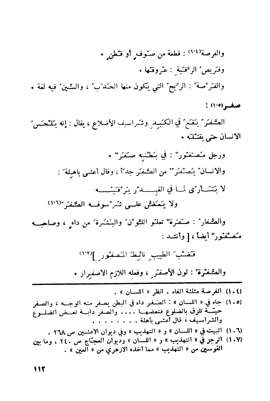 (105) جاء في اللسان: الصفر داء في البطن يصفر منه الوجه، والصفر حية تلزق بالضلوع فتعضها.... والصفر دابة تعض الضلوع والشراسيف، قال أعشى باهلة:........
