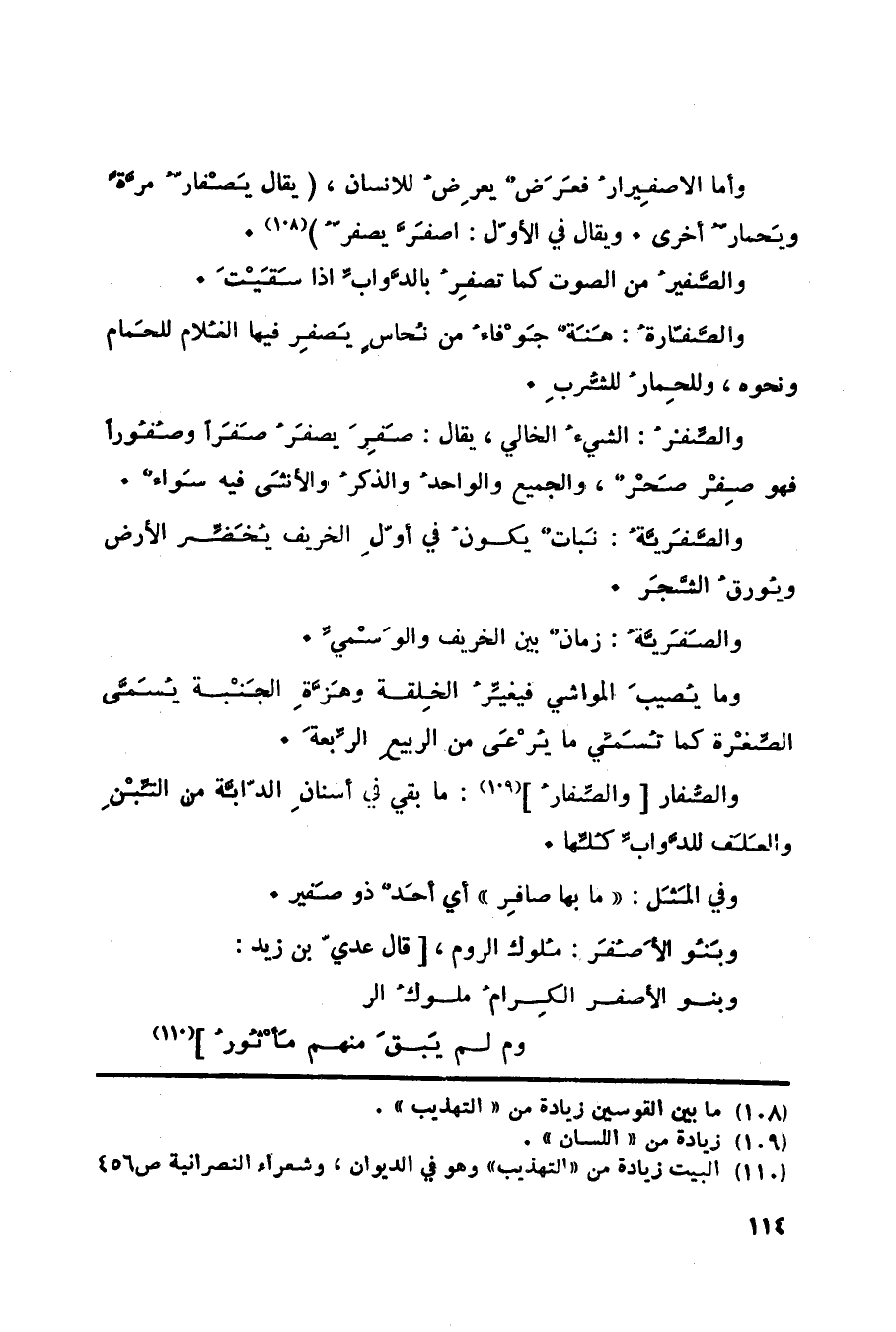 وأما الاصفِيرارُ فعَرَضٌ يعرِضُ للانسان، (يقال يَصْفارُّ مرَّةً ويَحمارُّ أخرى. ويقال في الأوّل: اصفَرَّ يصفرُّ) «108» . والصَّفيرُ من الصوت كما تصفِرُ بالدَّوابِّ اذا سَقَيْتَ. والصَّفّارةُ: هَنَةٌ جَوْفاءُ من نُحاسٍ يَصفِر فيها الغُلام للحَمام ونحوه، وللحِمارُ للشُّربِ. والصِّفرُ: الشيءُ الخالي، يقال: صَفِرَ يصفَرُ صَفَراً وصُفُوراً فهو صِفْر صَحْرٌ، والجميع والواحدُ والذكر والأنثى فيه سواء. والصَّفَريَّةُ: نَباتٌ يكونُ في أوّلِ الخريف يُخَضِّر الأرض ويُورقُ الشَّجَر. والصَفَريَّةُ: زمانٌ بين الخريف والوَسْميِّ. وما يُصيبَ المواشي فيغيِّرُ الخِلقة وهَزَّةِ الجَنْبة يُسَمَّى الصِّغْرة كما تُسَمِّي ما يُرْعَى من الربيعِ الرِّبعةَ. والصُّفار [والصِّفارُ] «109» : ما بقي في أسنانِ الدّابَّة من التِّبْنِ والعَلَف للدَّوابِّ كُلِّها. وفي المَثَل: ما بها صافِر أي أحَدٌ ذو صَفير. وبَنُو الأَصُفَر: مُلوك الروم، [قال عدي بن زيد:
