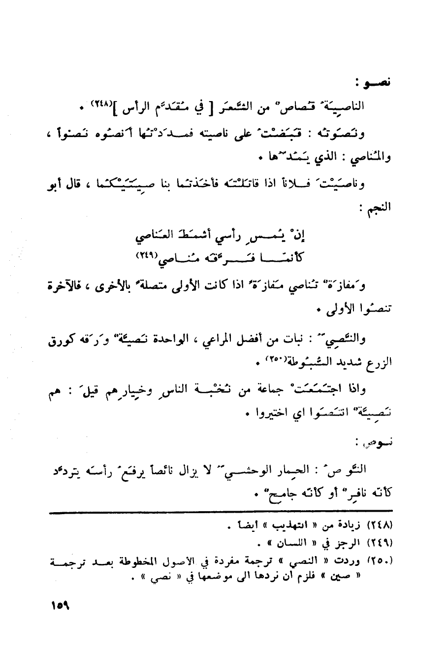 نصو: الناصِيَةُ قُصاصٌ من الشَّعَر [في مُقَدَّم الرأس] «248» . ونَصَوتُه: قَبَضْتُ على ناصيته فمدَدْتُها أنصُوه نصواً، والمُناصي: الذي يَمُدُّها. وناصَيْتَ فلاناً إذا قاتلته فأخذتما بناصيتيكما، قال أبو النجم: