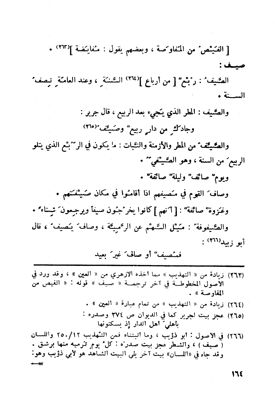 (263) زيادة من التهذيب مما أخذه الأزهري من العين، وقد ورد في الأصول المخطوطة في آخر ترجمة صيف قوله: الفيص من المفاوصة.