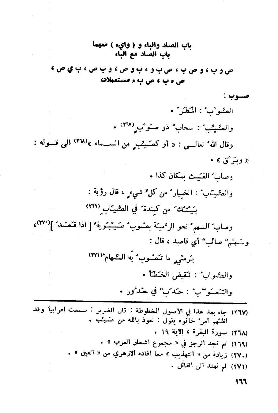 صوب: الصَّوْبُ: المَطَرُ. والصَّيِّبُ: سحابٌ ذو صَوْبٍ «267» . وقال اللهُ تعالى: أَوْ كَصَيِّبٍ مِنَ السَّماءِ «268» الى قوله: وَبَرْقٌ. وصابَ الغَيث بمكان كذا. والصُّيّابُ: الخِيارُ من كل شيء، قال رؤبة: