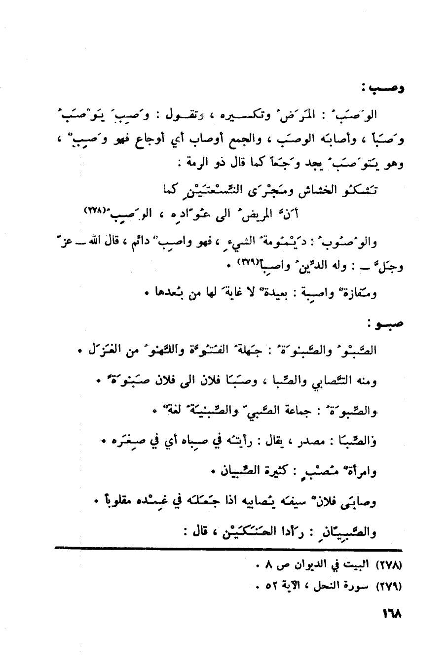 صبو: الصَّبْوُ والصَّبوَةُ: جَهلةُ الفُتُوَّة واللَّهوُ من الغَزَل. ومنه التَّصابي والصِّبا، وصَبَا فلان الى فلان صَبوَةً. والصِّبوَةُ: جماعة الصَّبيّ والصِّبيَةُ لغةٌ. والصِّبَا: مصدر، يقال: رأيتُه في صِباه أي في صِغَره. وامرأةٌ مُصْبٍ: كثيرة الصِّبيان. وصابَى فلانٌ سيفَه يُصابيه اذا جَعَلَه في غِمْده مقلوباً. والصَّبِيّانِ: رَأدا الحنكين، قال: