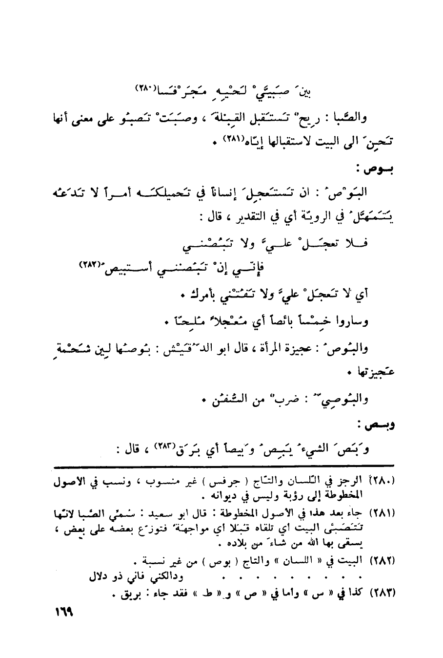 (281) جاء بعد هذا في الأصول المخطوطة: قال أبو سعيد: سمي الصبا لأنها تتصبى البيت أي تلقاه قبلا أي مواجهة فتوزع بعضه على بعض، يسقي بها الله من شاء من بلاده.