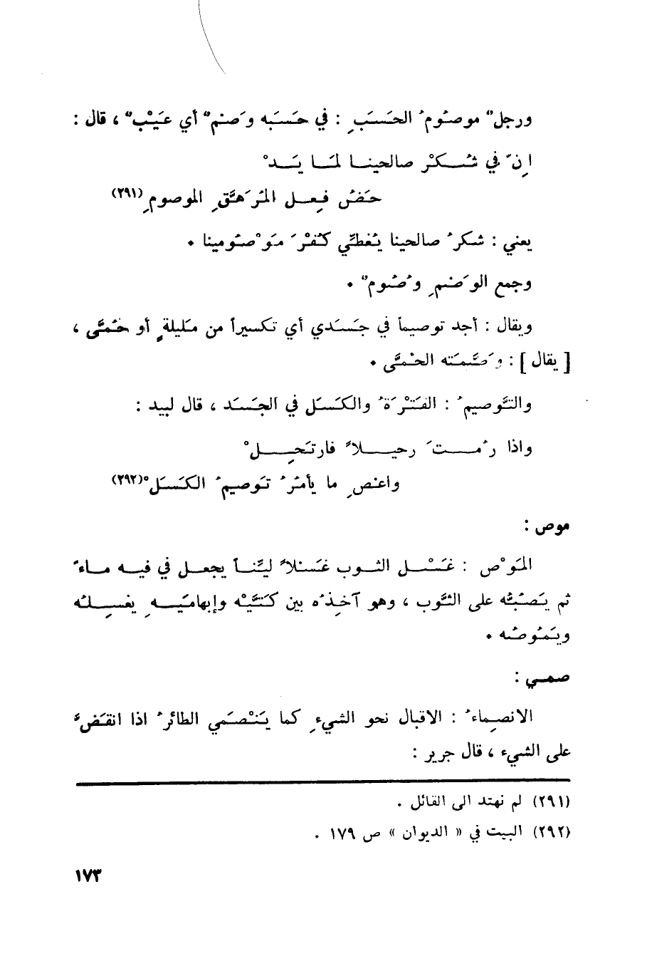 يعني: شكرُ صالحينا يُغطِّي كُفْرَ مَوْصُومينا. وجمع الوَصمِ وُصُومٌ. ويقال: أجد توصيماً في جَسَدي أي تكسيراً من مَليلةٍ أو حُمَّى، [يقال] : وَصَّمَته الحُمَّى. والتَّوصيمُ: الفَتْرَةُ والكَسَل في الجَسَد، قال لبيد: