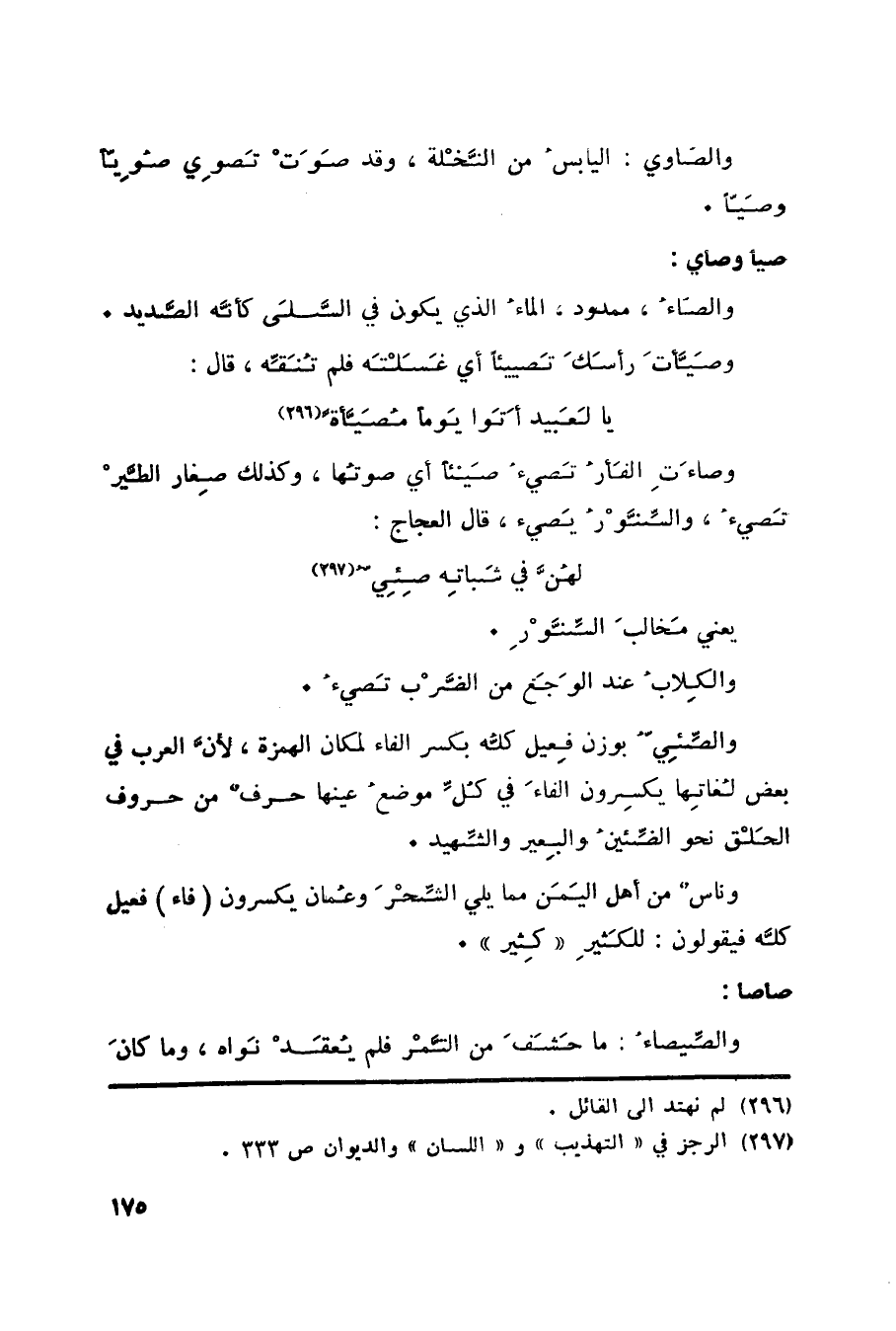 صيأ وصأي: والصَاءُ، ممدود، الماءُ الذي يكون في السَّلَى كأنَّه الصَّديد. وصَيَّأتَ رأسَكَ تَصييئاً أي غَسَلْتَه فلم تُنَقِّه، قال: