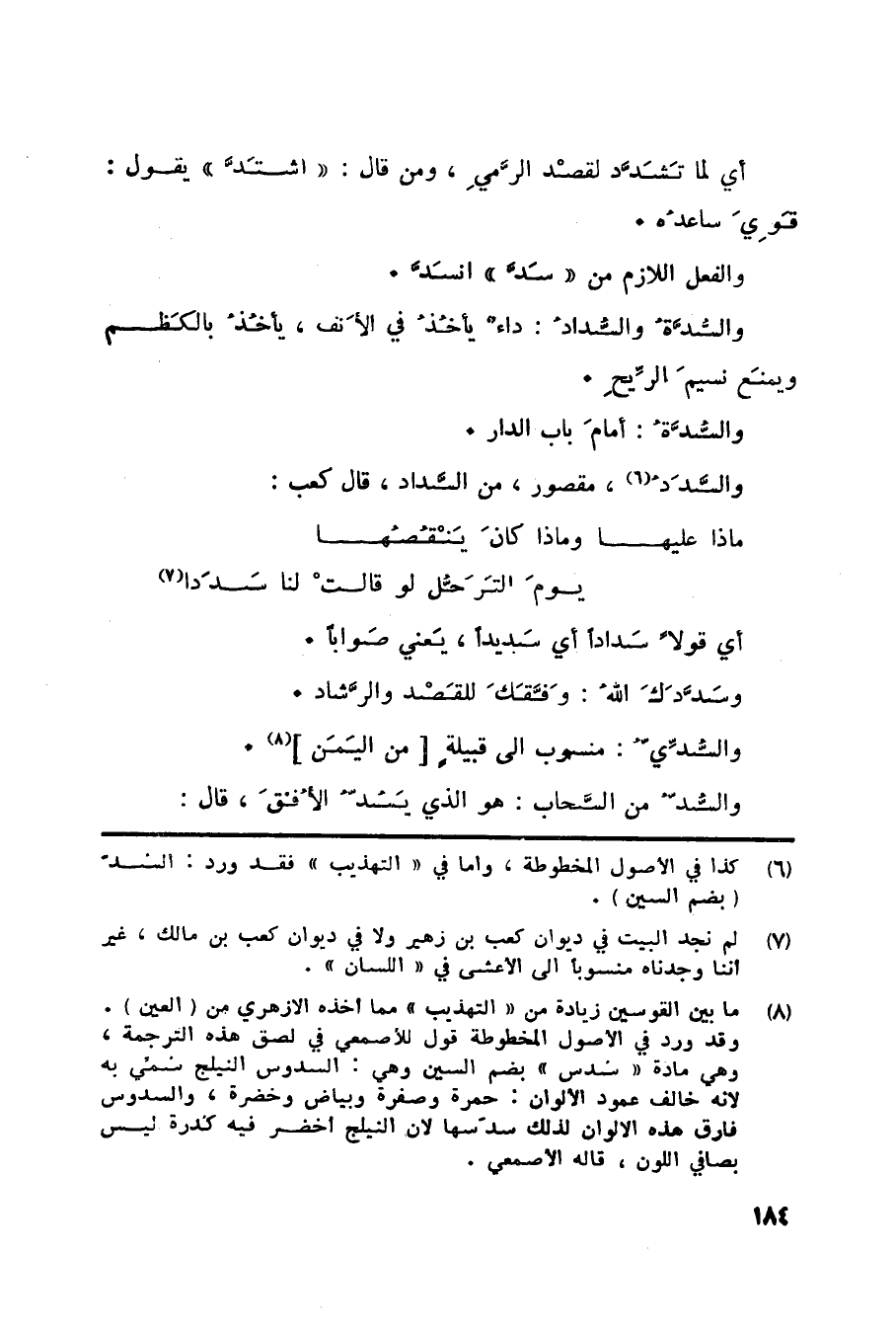 أي لما تَشَدَّد لقصْد الرَّمِي، ومن قال: اشتَدَّ يقول: قَوِيَ ساعدُه. والفعل اللازم من سَدَّ انسَدَّ. والسُّدَّةُ والسُّدادُ: داءٌ يأخُذُ في الأَنف، يأخُذُ بالكَظم ويمنَع نسيمَ الرِّيحِ. والسُّدَةُ: أمامَ باب الدار. والسَّدَدُ «6» ، مقصور، من السَّداد، قال كعب:
