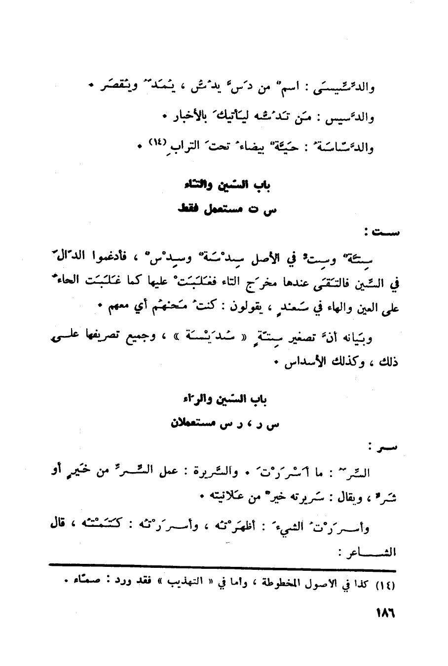 ست: سِتَّةٌ وسِتٌّ في الأصل سِدْسَةٌ وسِدْسٌ، فأدغموا الدّالُ في السِّين فالتَقَى عندها مخرَج التاء فغَلَبَتْ عليها كما غَلَبَت الحاءُ على العين والهاء في سَعدٍ، يقولون: كنتُ مَحهُم أي معهم. وبَيانه أنَّ تصغير سِتّةٍ سُدَيْسَة، وجميع تصريفها على ذلك، وكذلك الأسداس.