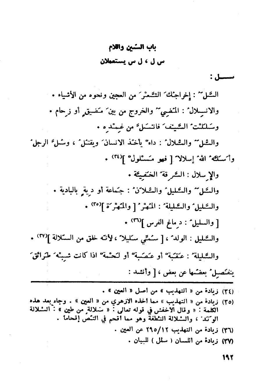 (35) زيادة من التهذيب مما أخذه الأزهري من العين. وجاء بعد هذه الكلمة: وقال الأخفش في قوله تعالى: سُلالَةٍ مِنْ طِينٍ: السلالة الوتد، والسلالة النطفة وهو مما أقحم في النص إقحاما.