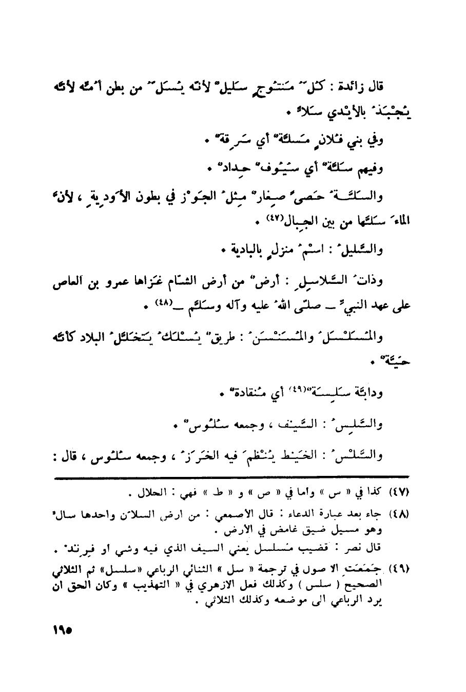 (49) جمعت الأصول في ترجمة سل الثنائي الرباعي سلسل ثم الثلاثي الصحيح (سلس) وكذلك فعل الأزهري في التهذيب وكان الحق أن يرد الرباعي إلى موضعه وكذلك الثلاثي.