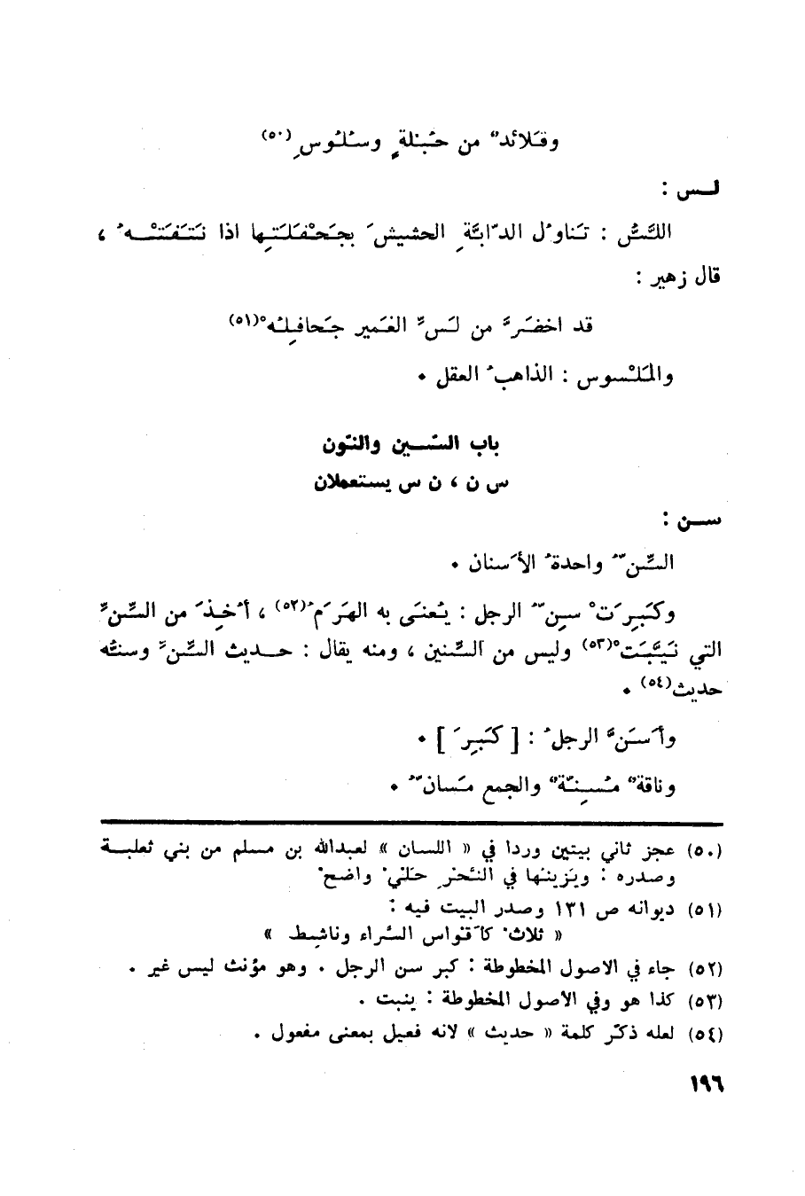 سن: السِّنُّ واحدةُ الأَسنان. وكَبِرَتْ سِنُّ الرجل: يُعنَى به الهَرَمُ «52» ، أُخِذَ من السِّنِّ التي نَيَّبَتْ «53» وليس من السِّنين، ومنه يقال: حديث السِّنِّ وسنُّه حديث «54» . وأَسَنَّ الرجلُ: [كَبِرَ] . وناقةٌ مُسِنّةٌ والجمع مسان.