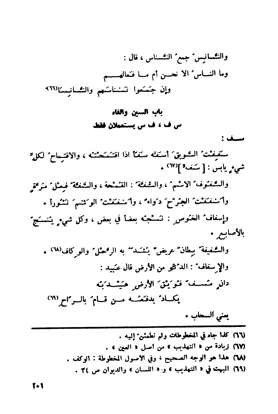 سف: سَفِفْتُ السَّويقَ أسَفُّه سَفّاً اذا اقتَمَحْتُه، والاقتِماحُ لكلَّ شيءٍ يابس: [سَفٌّ] «67» والسَّفُوفُ الاسْمُ، والسُّفَّةُ: القُمْحة، والسَّفَّةُ فِعْلُ مَرَّةٍ وأَسفَفْتُ الجُرْحَ دَواءً، وأَسفَفْتُ الوَشمَ نئورا. وإسفاف الخُوصِ: نَسْجُه بعضاً في بعض، وكل شيءٍ يُنسَجُ بالأصابِعِ. والسَّفيفةُ بِطانٌ عريضٌ يُشَدُّ به الرَّحْلُ والوِكاف «68» . والإِسفافُ: الدُنُّو من الأرض قال عَبيد: