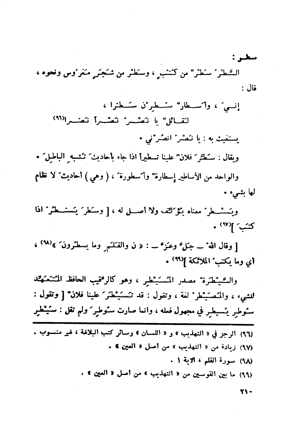 يستغيث به: يا نَصْرُ انصُرْني. ويقال: سَطَّرَ فلانٌ علينا تسطيراً اذا جاء بأحاديثَ تُشبهِ الباطِلَ. والواحد من الأساطير إِسطارةٌ وأُسطورةُ، (وهي) أحاديثُ لا نظام لها بشيء. ويَسْطرُ معناه يُؤَلِّف ولا أصل له، [وسَطرَ يَسطُرُ اذا كتَبَ] «97» . [وقال الله جل وعز-: ن وَالْقَلَمِ وَما يَسْطُرُونَ
