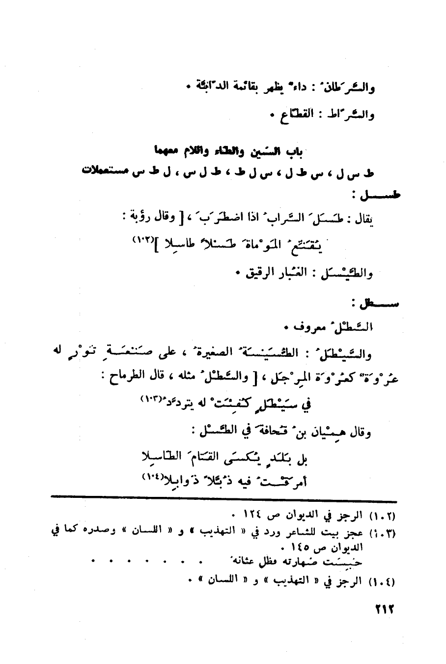 باب السين والطاء واللام معهما ط س ل، س ط ل، س ل ط، ط ل س، ل ط س مستعملات