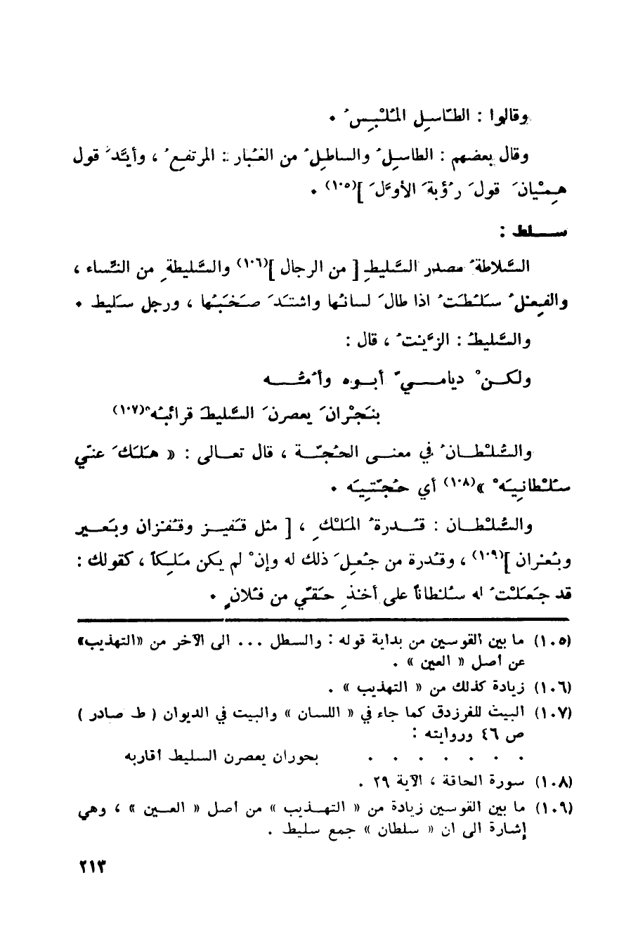 (109) ما بين القوسين زيادة من التهذيب من أصل العين، وهي إشارة إلى أن سلطان جمع سليط.