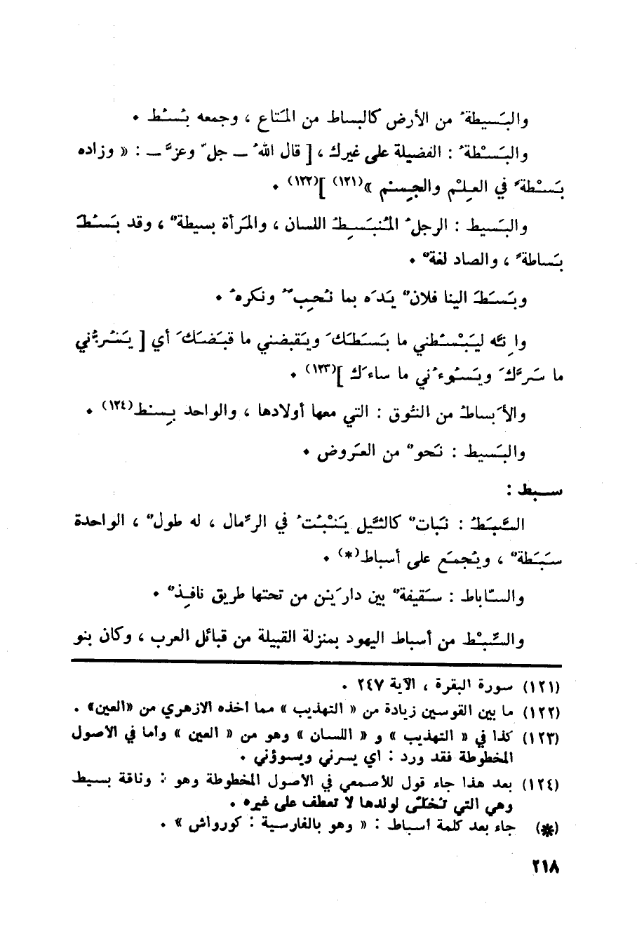 سبط: السَّبَطُ: نَباتٌ كالثَّيل يَنْبُتُ في الرِّمال، له طولٌ، الواحدة سَبَطةٌ، ويُجمَع على أسباط «125» . والسّاباط: سَقيفةٌ بين دارَين من تحتها طريق نافِذٌ. والسِّبْط من أسباط اليهود بمنزلة القبيلة من قبائل العرب، وكان بنو