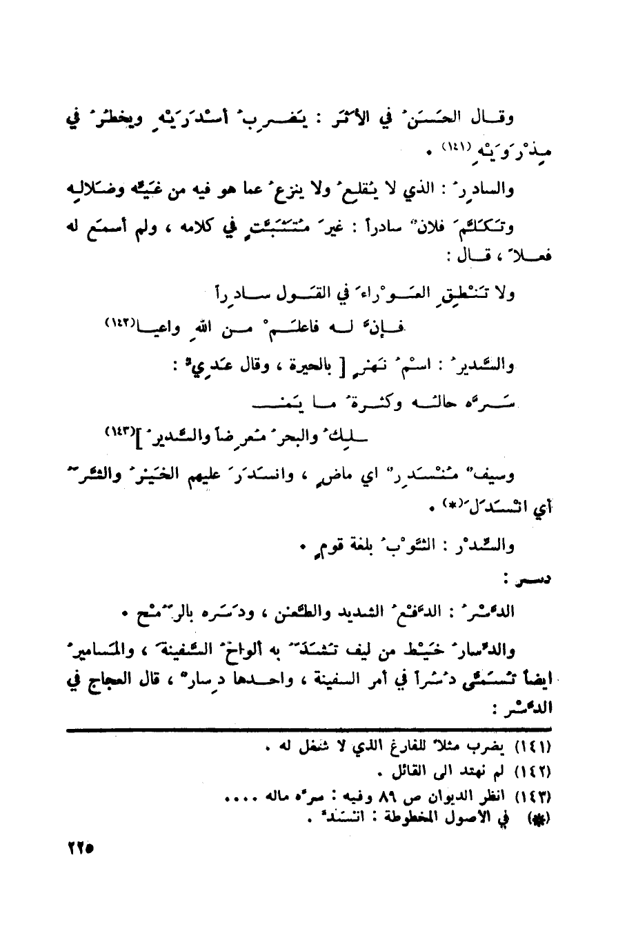 وقال الحَسَنُ في الأَثَر: يَضرِبُ أسْدَرَيْهِ ويخطُرُ في مِذْرَوَيْهِ «141» . والسادِرُ: الذي لا يُقلِعُ ولا ينزعُ عما هو فيه من غَيِّه وضَلالِه وتَكَلَّمَ فلانٌ سادراً: غيرَ مُتَثَبَّتٍ في كلامه، ولم أسمع له فعلا، قال:
