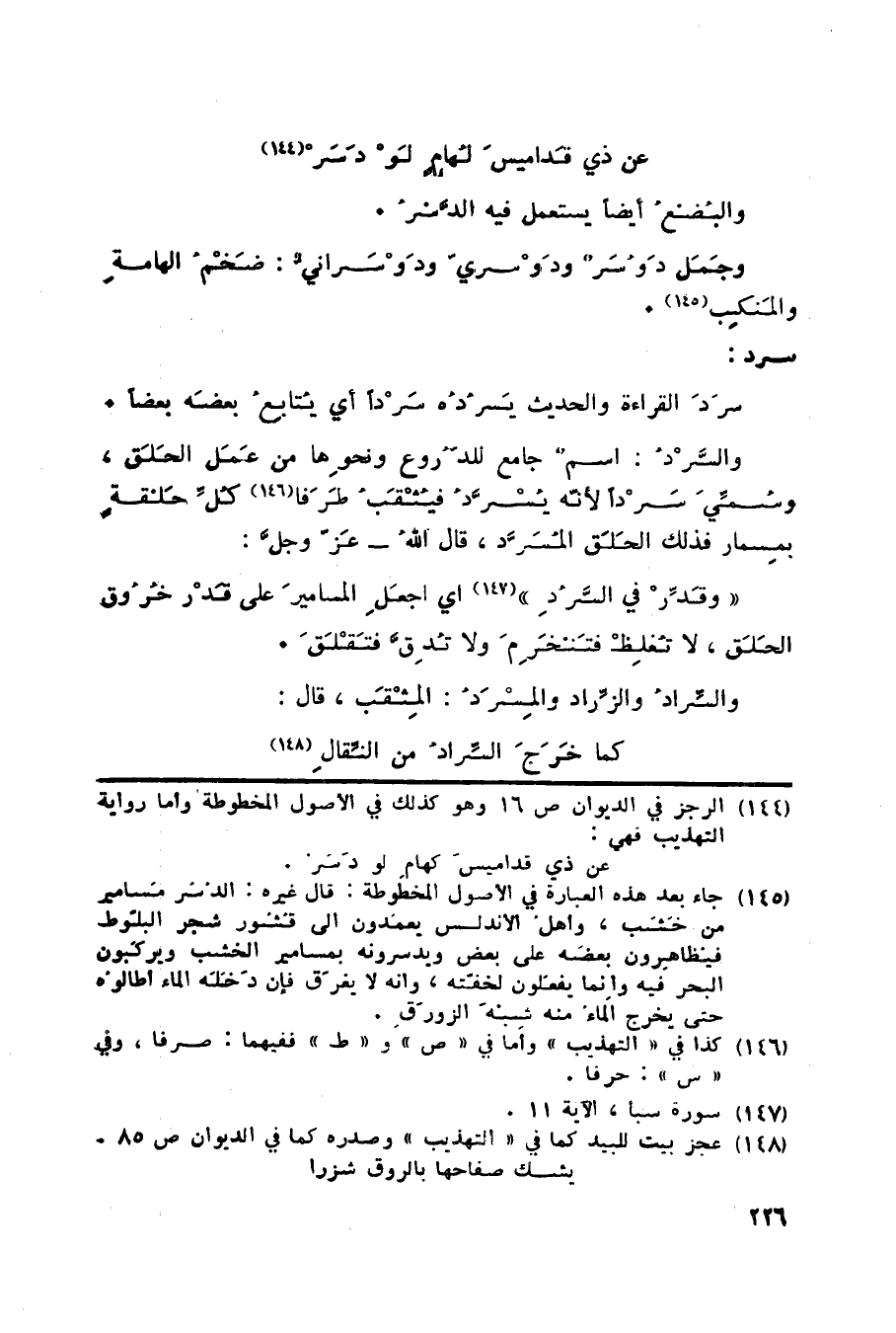 سرد: سرَدَ القراءة والحديث يَسرُدُه سَرْداً أي يُتابِعُ بعضَه بعضاً. والسَّرْدُ: اسمٌ جامع للدُّروع ونحوِها من عَمَل الحَلَق، وسُمِّيَ سَرْداً لأنّه يُسْرَّدُ فيُثْقَبُ طَرَفا «146» كُلِّ حَلقةٍ بمِسمار فذلك الحَلَق المُسَرَّد، قال الله- عز وجل: وَقَدِّرْ فِي السَّرْدِ