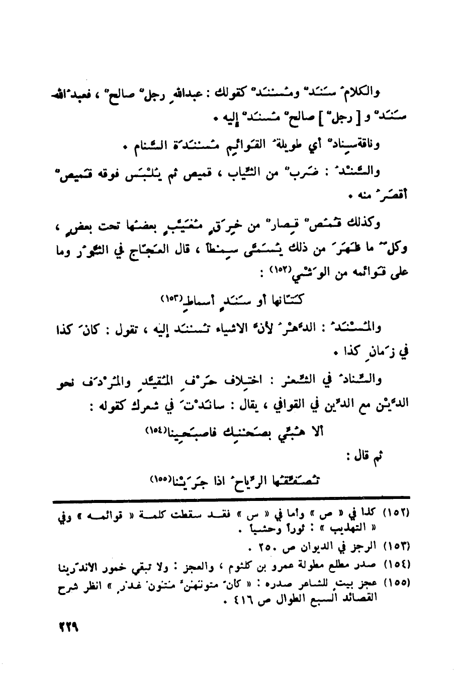 والكلامُ سَنَدٌ ومُسنَدٌ كقولك: عبد اللهِ رجلٌ صالحٌ، فعبد الله سند و [رجل] صالحٌ مُسنَدٌ إليه. وناقة سِنادٌ أي طويلةُ القَوائِم مُسنَدَة السَّنام. والسَّنْدُ: ضَربٌ من الثِّياب، قميص ثم يُلْبَس فوقه قَميصٌ أقصَرُ منه. وكذلك قُمُصٌ قِصارٌ من خِرَقٍ مُغَيَّبٍ بعضُها تحت بعض، وكل ما ظهر من ذلك يُسَمَّى سِمطاً، قال العَجّاج في الثَّوُر وما على قَوائمه من الوَشْي «152» :
