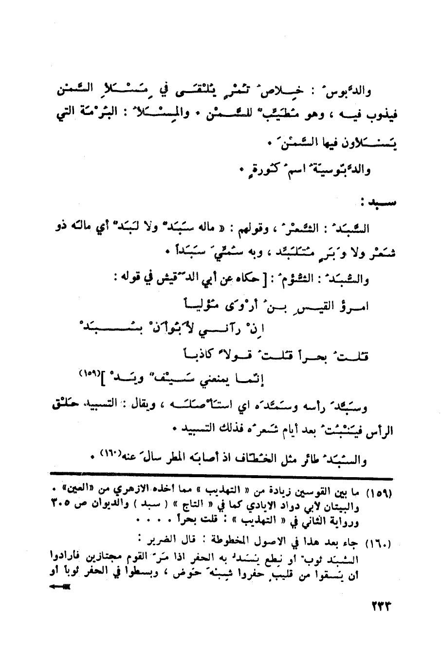 (160) جاء بعد هذا في الأصول المخطوطة: قال الضرير: السبد ثوب أو نطع يسد به الحفر إذا مر القوم مجتازين فأرادوا أن يسقوا من قليب حفروا شبه حوض، وبسطوا في الحفر ثوبا أو نحوه ثم صبوا الماء عليه فسقوا مطاياهم فذلك هو السبد. وضل من جعله طائرا لقول الشاعر: