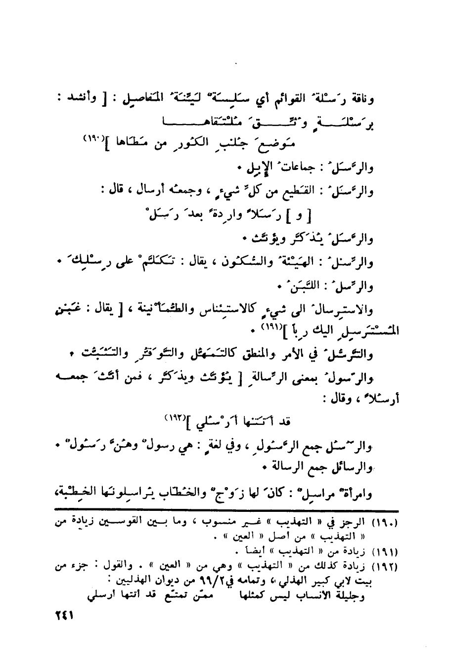 والرُّسُل جمع الرَّسُولِ، وفي لغةٍ: هي رسولٌ وهُنَّ رَسُولٌ. والرسائل جمع الرسالة. وامرأةٌ مراسِلٌ: كانَ لها زَوْجٌ والخطاب يراسلونها الخطبة،