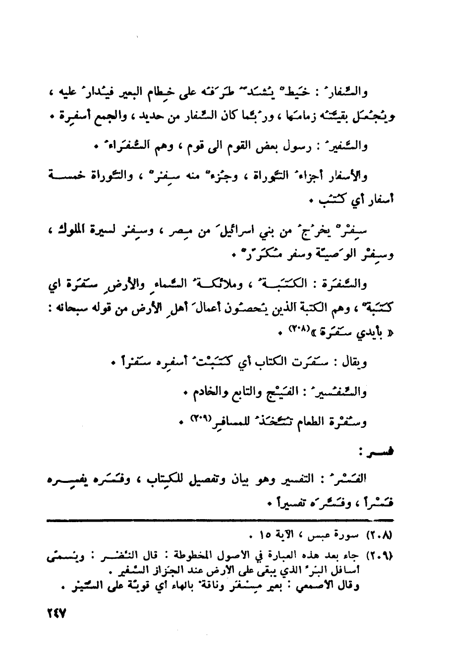 والسفار: خَيطٌ يُشَدُّ طَرَفه على خِطام البعير فيُدارُ عليه ويُجُعَل بقيَّتُه زمامَها، ورُبَّما كان السِّفار من حديد، والجمع أسفرة. والسَّفيرُ: رسول بعض القوم إلى قوم، وهم السُّفَراءُ. والأسفار أجزاءُ التَّوراة، وجُزءٌ منه سِفرٌ، والتَّوراة خمسة أسفار أي كُتُب. سِفْرٌ يخرُجُ من بني إسرائيلَ من مِصر، وسِفر لسيرة الملوك، وسِفْر الوَصيّة وسفر مُكَرّرٌ. والسَّفَرة: الكَتَبةُ، وملائكةُ السَّماءِ والأرضِ سَفَرة أي كتبة، وهم الكتبة الذين يُحصُون أعمالَ أهلِ الأرض من قوله سبحانه: بِأَيْدِي سَفَرَةٍ «208» . ويقال: سَفَرت الكتاب أي كَتَبْتُ أسفِره سفرا. والسفسير: الفَيْج والتابع والخادم. وسُفْرة الطعام تُتَّخَذُ للمسافرِ «209» .