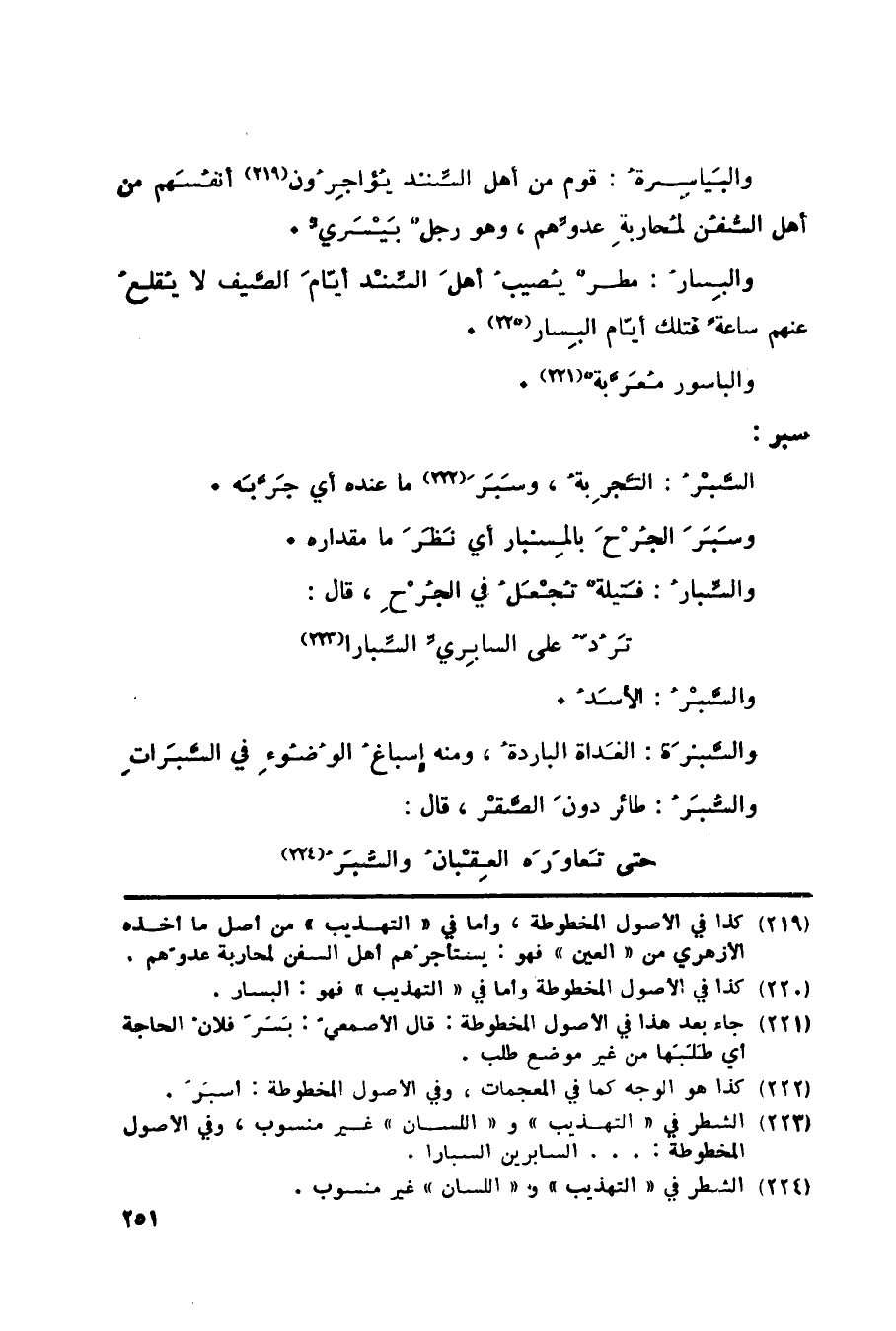 والبَياسرةُ: قوم من أهل السِّند يُؤاجِرُون «219» أنفُسَهم من أهل السُّفُن لمُحاربةِ عدوِّهم، وهو رجلٌ بَيْسَريُّ. والبِسارَ: مطرٌ يُصيبُ أهلَ السِّنْد أيّامَ الصَّيف لا يُقلِعُ عنهم ساعة فتلك أيّام البِسار «220» . والباسور مُعَرَّبةٌ «221» .