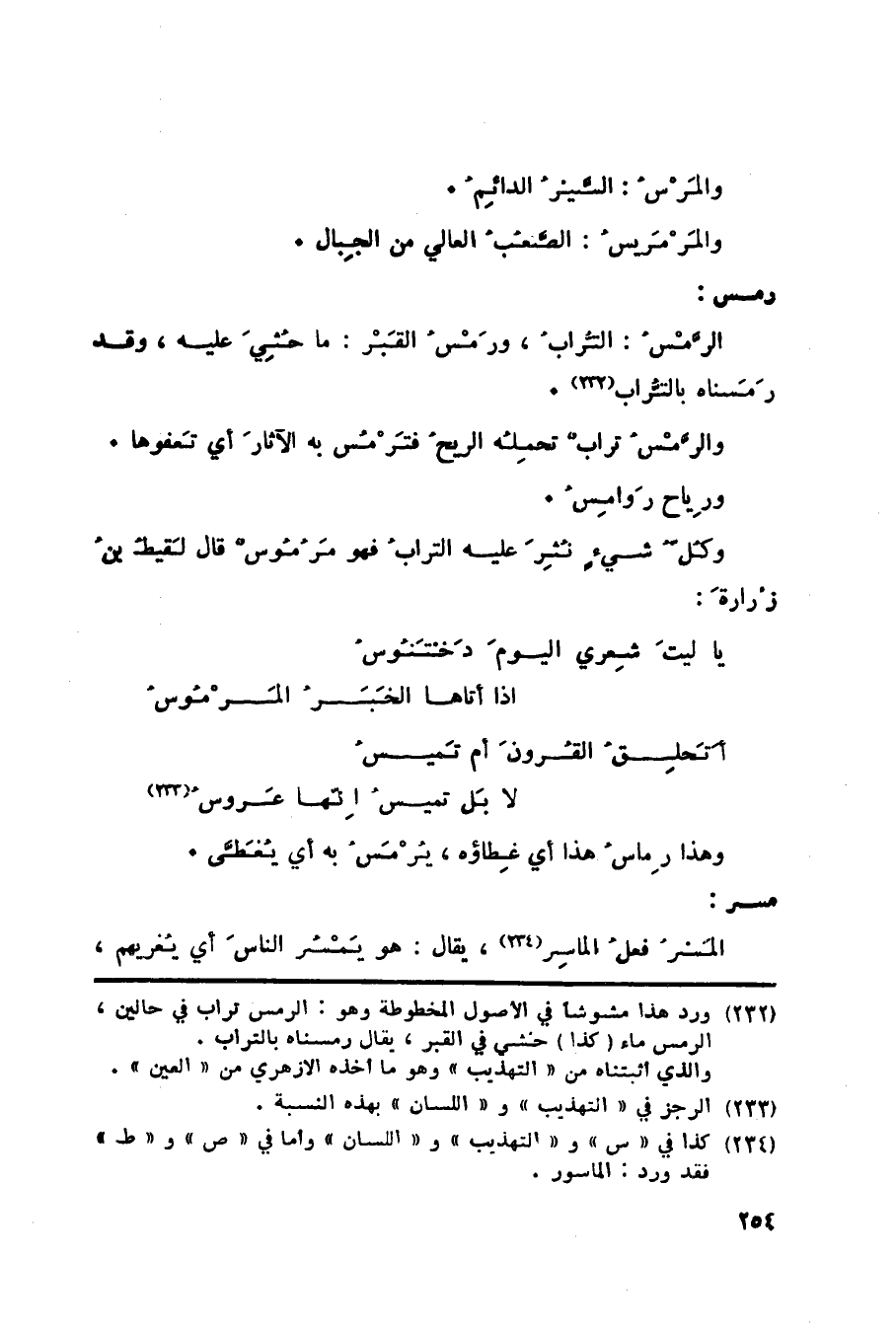 (232) ورد هذا مشوشا في الأصول المخطوطة وهو: الرمس تراب في حالين، الرمس ماء (كذا) حشي في القبر، يقال رمسناه بالتراب. والذي أثبتناه من التهذيب وهو ما أخذه الأزهري من العين.