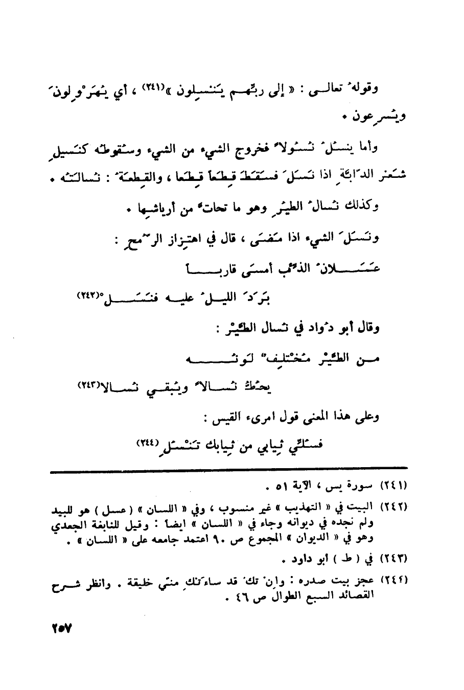 وقولهُ تعالى: إِلى رَبِّهِمْ يَنْسِلُونَ «241» ، أي يهرولون ويُسرِعون. وأما ينسُلُ نُسُولاً فخروج الشيء من الشيء وسُقوطُه كنَسيلِ شَعر الدّابَّةِ إذا نَسَلَ فسَقَطَ قِطَعاً قطعاً، والقِطعَةُ: نُسالَتُه. وكذلك نُسالُ الطُيرِ وهو ما تحاتَّ من أرياشِها. ونَسَلَ الشيء إذا مَضَى، قال في اهتِزاز الرُّمحِ: