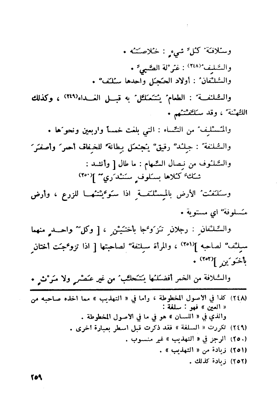 (248) كذا في الأصول المخطوطة، وأما في التهذيب مما أخذه صاحبه من العين فهو: سلفة: والذي في اللسان هو في ما في الأصول المخطوطة.