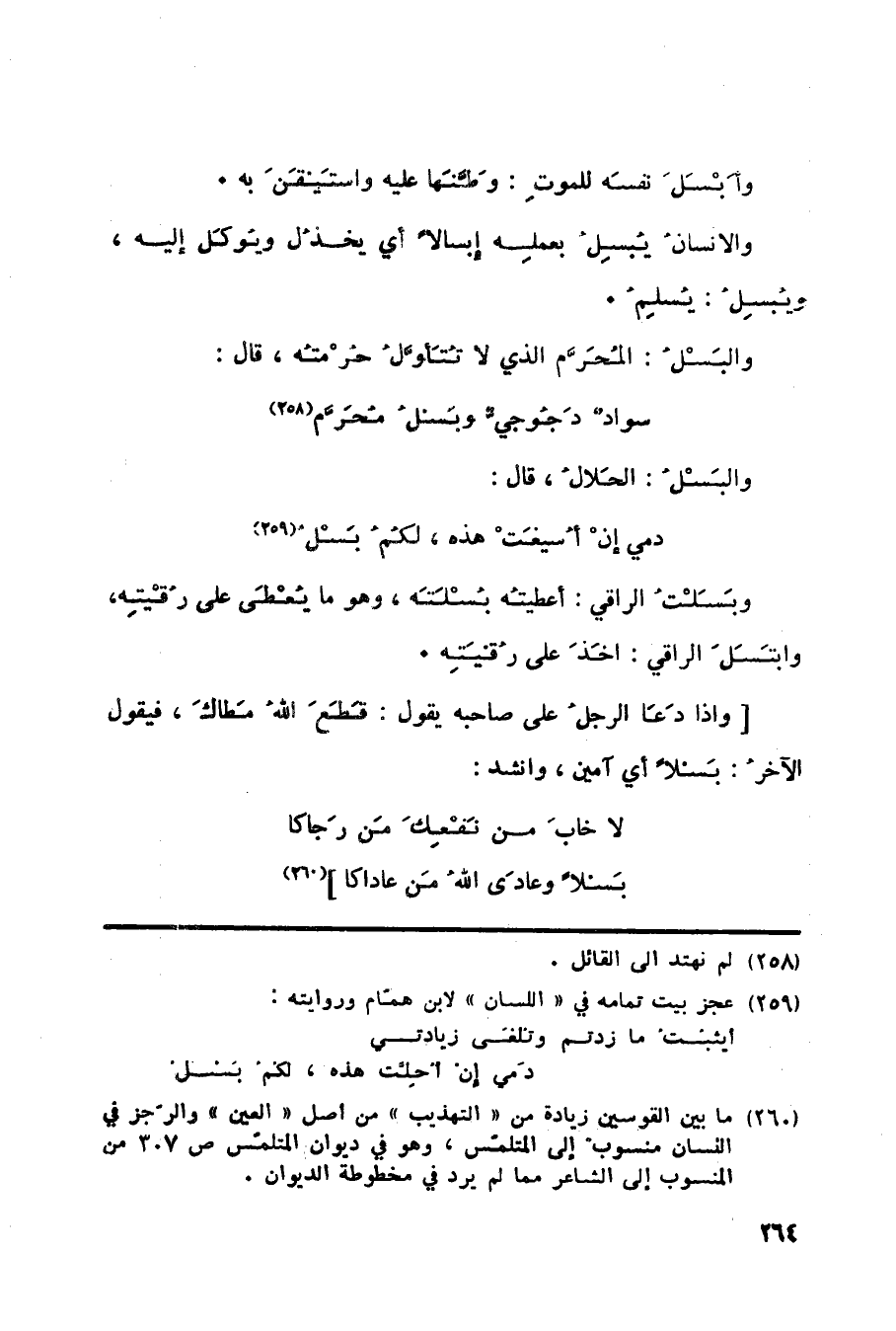 (260) ما بين القوسين زيادة من التهذيب من أصل العين والرجز في اللسان منسوب إلى (المتلمس) ، وهو في ديوان المتلمس ص 307 من المنسوب إلى الشاعر مما لم يرد في مخطوطة الديوان.