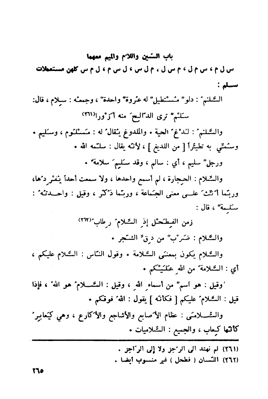 باب السين واللام والميم معهما س ل م، س م ل، م س ل، م ل س، ل س م، ل م س كلهن مستعملات