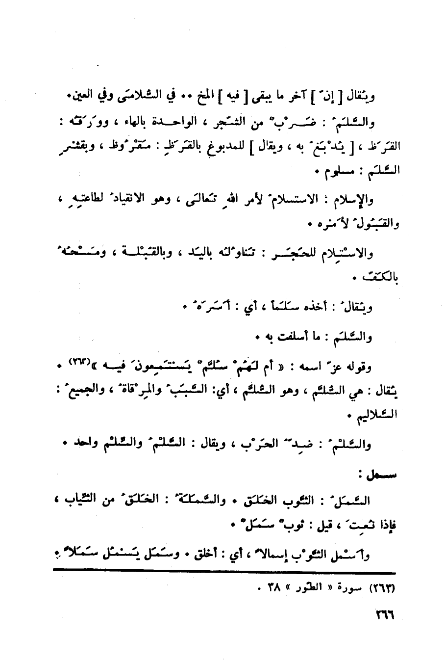 ويقالُ [إنّ] آخر ما يبقى [فيه] المخ.. في السُّلامَى وفي العين. والسَّلَمُ: ضرب من الشجر، الواحدة بالهاء، ووَرَقُه: القَرَظ، [يُدْبَغُ به، ويقال] للمدبوغ بالقَرَظِ: مَقْرُوظ، وبقشرِ السَّلَم: مسلوم. والإسلام: الاستسلامُ لأمر اللهِ تَعالَى، وهو الانقيادُ لطاعتِهِ، والقَبُولُ لأَمره. والاسْتِلام للحَجَر: تَناوُلُه باليَد، وبالقُبْلة، ومَسْحُهُ بالكَفّ. ويُقالُ: أخذه سَلَماً، أي: أسره. والسلم: ما أسلفت به. وقوله عزّ اسمه: أَمْ لَهُمْ سُلَّمٌ يَسْتَمِعُونَ فِيهِ «263» . يُقال: هي السُّلَّم، وهو السُّلَّم، أي: السَّبَبُ والمِرْقاةُ، والجميعُ: السَّلاليم. والسَّلْمُ: ضِدُّ الحَرْب، ويقال: السَّلْمُ والسِّلْم واحد.