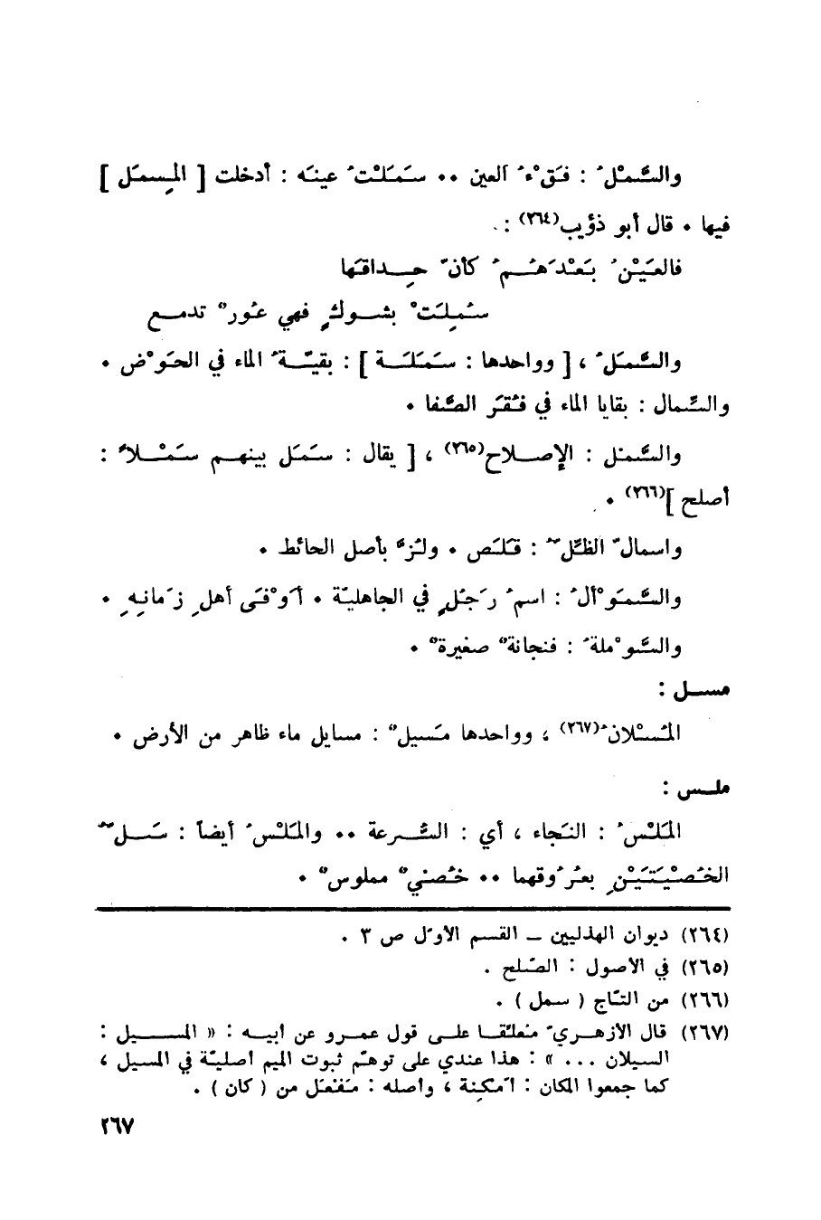 (267) قال الأزهري معلقا على قول عمرو عن أبيه: المسيل: السيلان ... : هذا عندي على توهم ثبوت الميم أصلية في المسيل، كما جمعوا المكان: أمكنة، وأصله: مفعل من (كان) .
