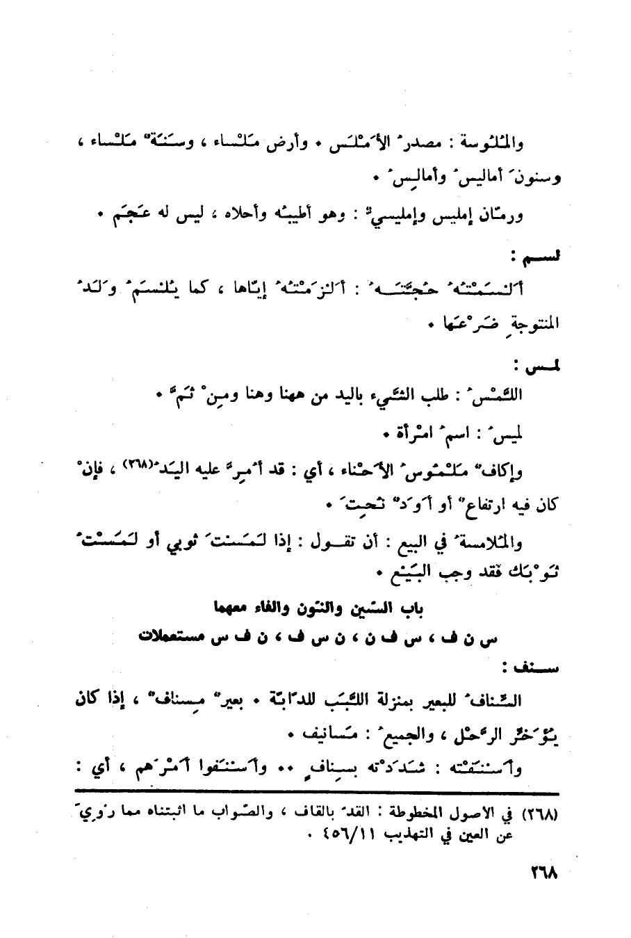 باب السين والنون والفاء معهما س ن ف، س ف ن، ن س ف، ن ف س مستعملات