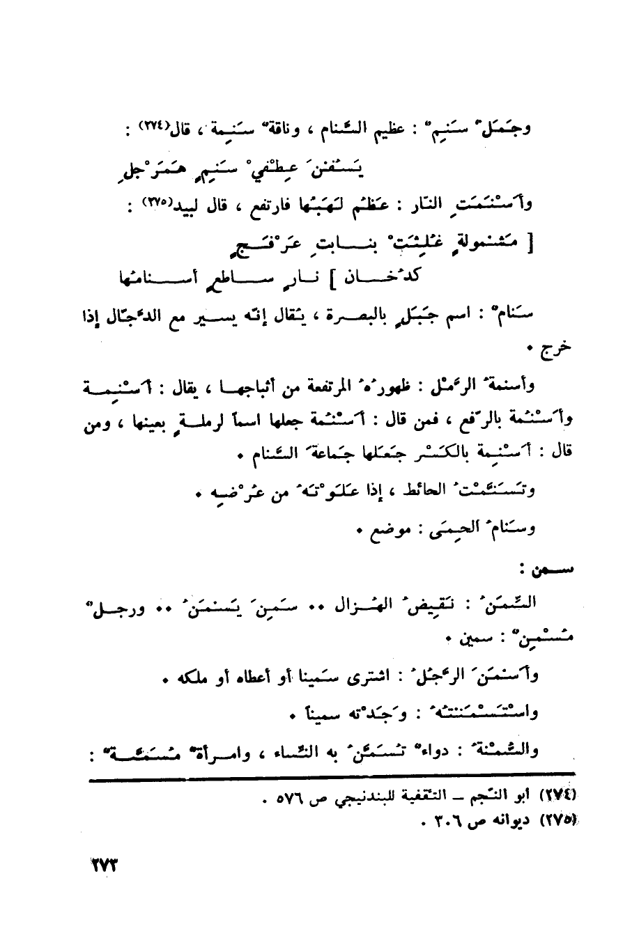 سَنامٌ: اسم جَبَلٍ بالبصرة، يُقال إنّه يسير مع الدَّجّال إذا خرج. وأسنمةُ الرَّمْل: ظهورُهُ المرتفعة من أثباجها، يقال: أَسْنِمة وأَسْنُمة بالرّفع، فمن قال: أَسْنُمة جعلها اسماً لرملةٍ بعينها، ومن قال: أَسْنِمة بالكَسْر جَعَلها جَماعةَ السَّنام. وتَسَنَّمْتُ الحائط، إذا علوته من عرضه. وسنام الحِمَى: موضع.