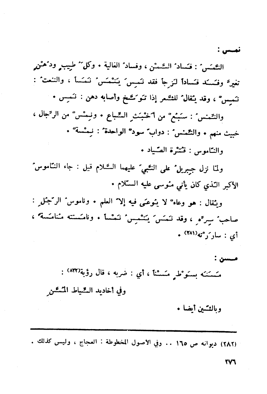 نمس: النَّمَسُ: فَسادُ السَّمْن، وفسادُ الغالية. وكلُّ طِيبٍ ودُهْنٍ تغيرَّ وفَسَد فَساداً لَزِجاً فقد نَمِسَ يَنْمَسُ نَمَساً، والنعتُ: نَمِسٌ، وقد يُقالُ للشَّعر إذا تَوَسَّخ وأصابه دهن: نَمِس. والنِّمسُ: سَبُعٌ من أَخْبَثِ السِّباع. ونِمْسٌ من الرِّجال، خبيث منهم. والنمس: دوابّ سودٌ الواحدةُ: نِمْسةٌ. والنّاموس: قُتْرة الصّياد. ولمّا نزل جِبريلُ على النَّبيّ عليهما السَّلام قيل: جاء النّاموسُ الأكبر الذّي كان يأتي مُوسى عليه السّلام. ويُقال: هو وعاءٌ لا يُوَعى فيه إلاّ العلم. وناموسُ الرّجُلِ: صاحبُ سِرِّهِ، وقد نَمَسَ يَنْمِسُ نَمْساً. ونامَسته مُنامَسةً، أي: سارَرْته «281» .